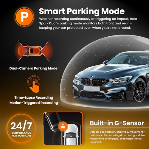 - Front and Rear Dash Camera – The Halo Spark Dual includes a second rear-facing camera, recording in 1080p Full HD to capture every angle of your journey. Whether it’s a tailgater, a rear-end collision, or suspicious activity while parked, you’ll have a clear, timestamped view from both front and back, all stored seamlessly and securely via the Halo app.