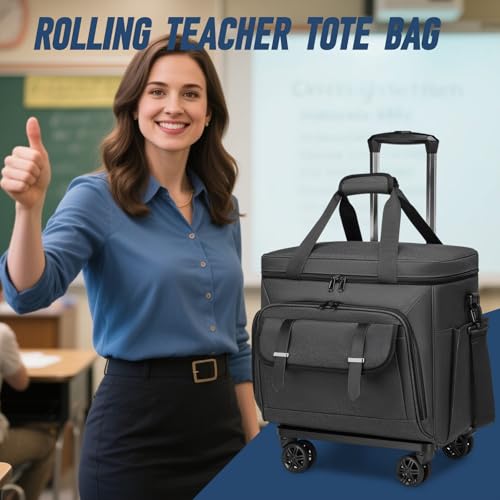 Rolling Teacher Tote Bag for Women Men,Large Tote Bag with Detachable Wheels Trolley,15.6 Inch Laptop Wheeled Teacher Bag for Work Office