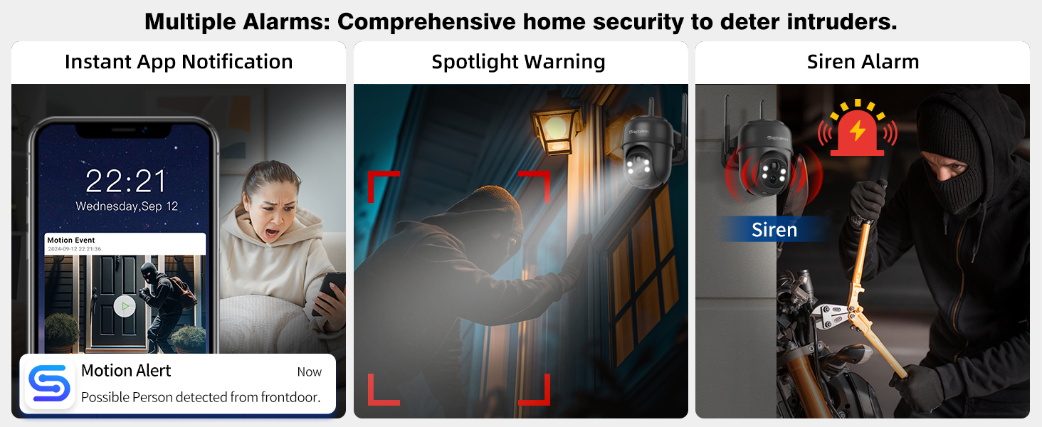 - 【PIR Motion Sensor with Spotlights and Siren】Equipped with advanced PIR sensor technology, this wireless outdoor security camera swiftly detects human presence and sends prompt alarm notifications. When motion is detected, it sends instant alarm notifications, records alarm video and audio, and activates an alarm sound and spotlight to deter unwanted visitors.