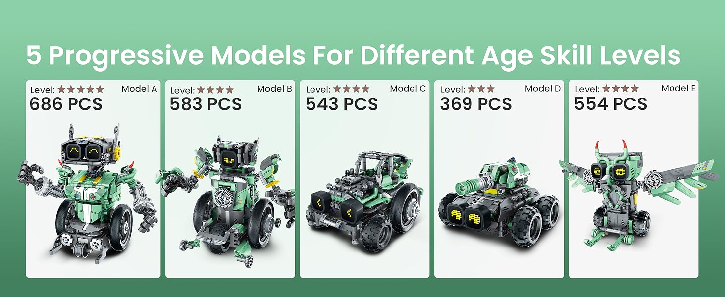 5-in-1 Building Design: Robot set includes 727 pieces that can be rebuilt into five cool designs—Robot, Car, Tank, and Owl. Beginners can start with simpler builds, while experienced builders can take on more complex challenges