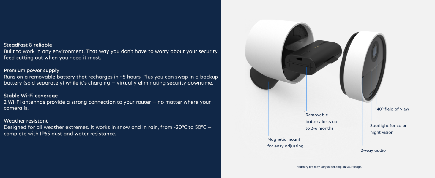 - INSTANT NOTIFICATIONS: The motion sensor camera detects movement up to 30 ft away, triggering the spotlight and sending a push notification. With up to 3 month battery life & IP65 weatherproof rating, this camera is built to last