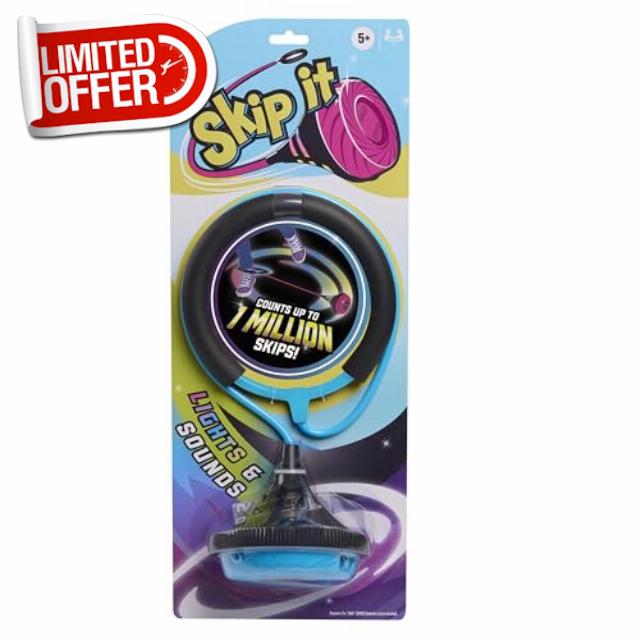 Get up and be active with Skip It. This revamp of the classic 90s toy has all the fun of the original – but with sounds, lights, and a digital counter! Slip the padded ring around the ankle. Flip the on switch and press the button to start a new game. Swing it around and skip over the tubing as it circles. The digital display tallies each skip. Kids see a colorful light show as they play. Turn sound mode on to hear cool sound effects and phrases like “New record set!” Press the button three times to hear the all-time high score and the lifetime count – up to a million skips! This classic, retro toy boosts coordination as kids try to beat their high scores. Add multiple Skip It toys in either blue or pink (each sold separately) to host a friendly competition. For best results, use Skip It on hard, flat surfaces. Ensure pants don’t get in the way of the ankle ring. This nostalgic toy makes a fantastic birthday or anytime surprise for kids ages 5 years and up. © 2025 ABD Ltd/Hasbro/HCPL Ltd.