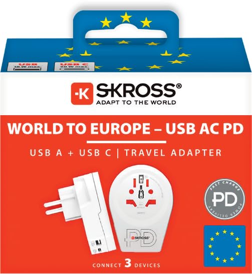 Skross World to Europe USB AC20PD Travel Adapter, With 1 USB Type C And 1 USB Type A Port, Fast Charging, Power Delivery, Shock Protectio