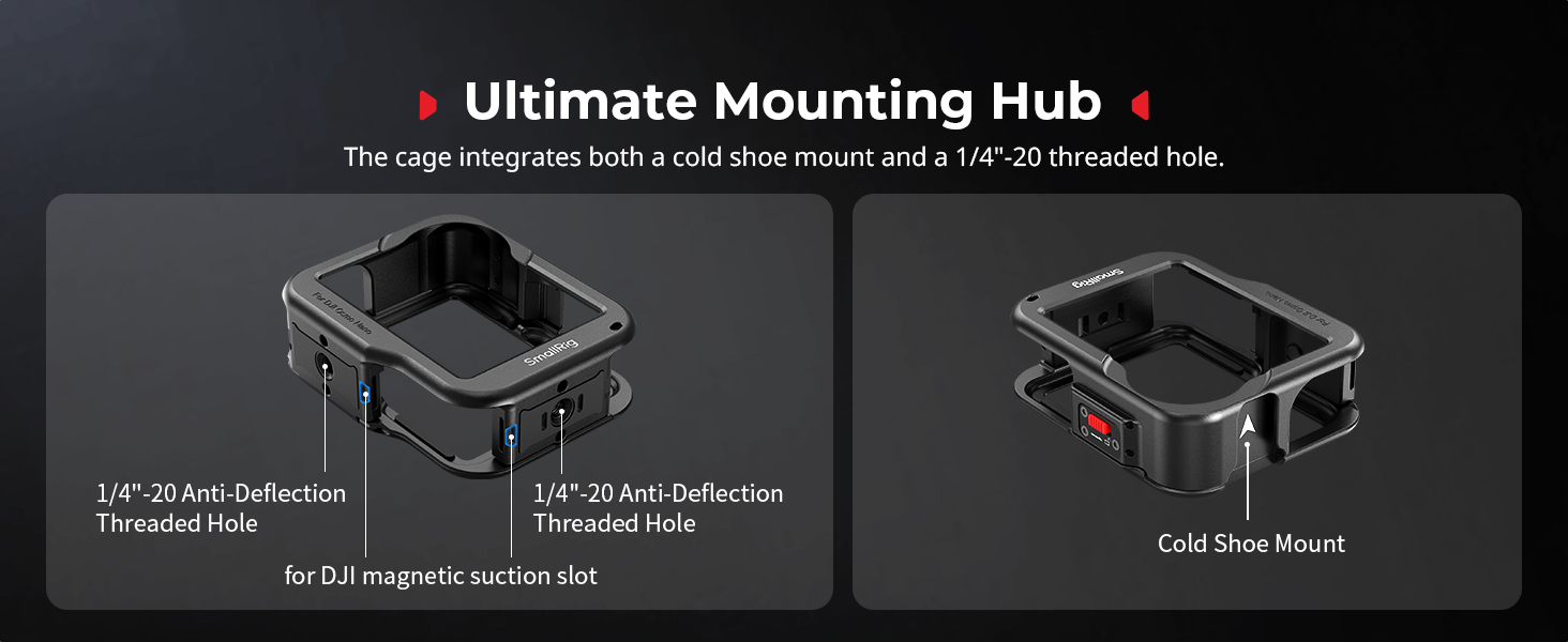 - Universal Compatibility – the cage integrates both a cold shoe mount and a 1/4"-20 threaded hole, enabling users to easily attach external accessories such as microphones or LED lights. This versatility makes it ideal for vlogging, travel filming, and various shooting scenarios.