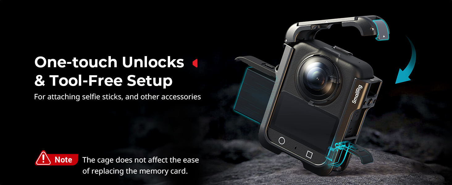 - Tool-Free Setup – It features a side-mounted one-touch unlocking lever for effortless installation and removal. Strategically placed access cutouts allow for convenient SD card swaps and seamless attachment of selfie sticks without requiring cage removal.