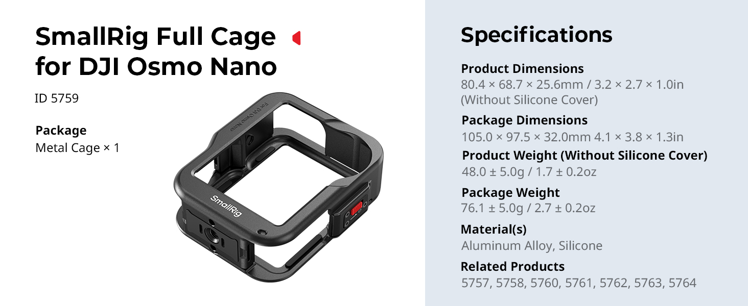 - Full Protection – SmallRig Full Cage for DJI Osmo Nano 5759 offers all-round impact protection and enhanced expandability in a lightweight design. Crafted from durable aluminum alloy with internal silicone pads, this full-cover cage ensures maximum safety of your camera while maintaining a sleek profile.
