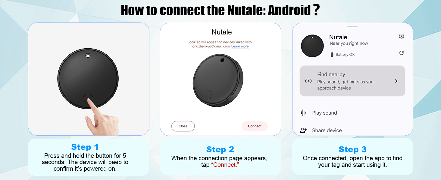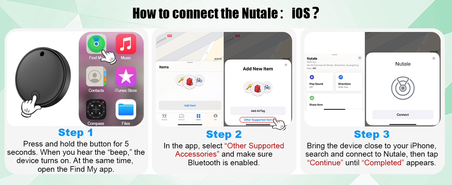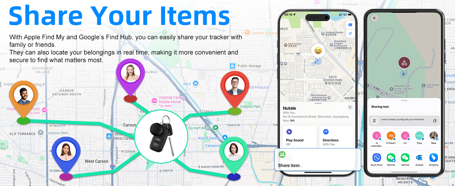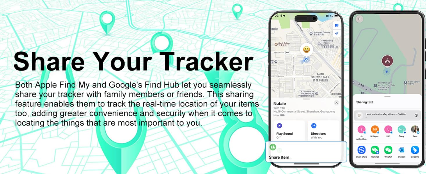 1 Easy to Find 2 Accurate Positioning 3 Share location 4 Privacy Protected 5 Replaceable Battery 1 IP67 Waterproof 2 Lightweight, Compact 3 Long-Distance Tracking 4 Finding Lost ltems 5 Protect Your Belongings
