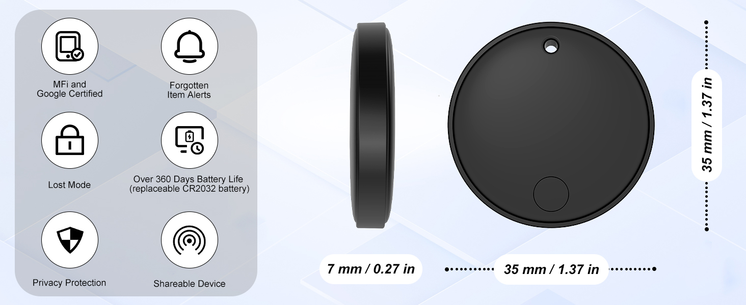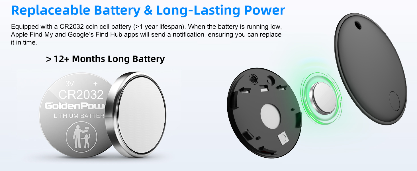 Secure Encryption for Privacy Protection:IP67 Water & Dust Resistance – Replaceable Battery,IP67-rated dustproof and waterproof design withstands rain, spills, and brief submersion (up to 3 ft / 1m deep), making it ideal for travel and outdoor use. This slim, lightweight tracker features a user-replaceable coin-shaped CR2032 battery and is designed to attach discreetly to keys, bags, or pet collars.
