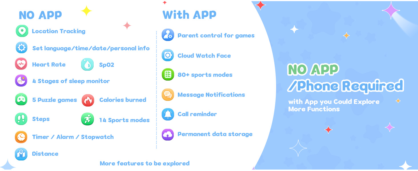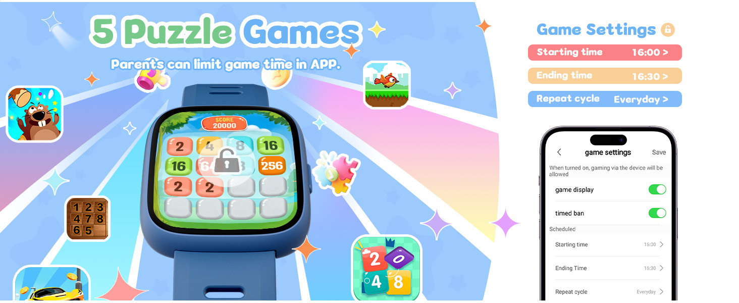 - Puzzle Games & Parental Controls Equipped with 5 built-in puzzle games to boost reaction and calculation skills, this smartwatch also includes parental controls. Use the app to restrict game access during school hours or lock games entirely, ensuring a balanced experience.