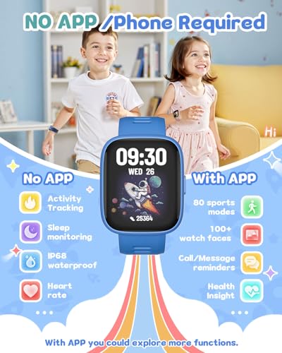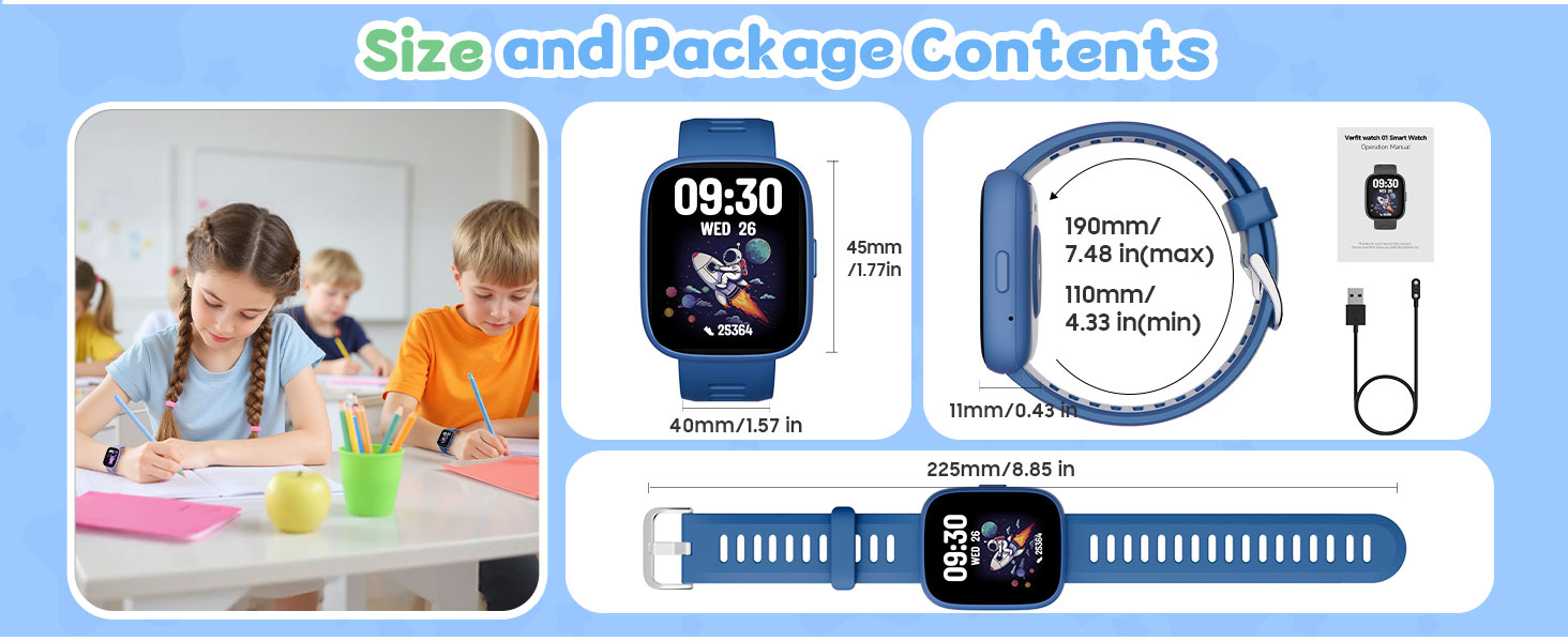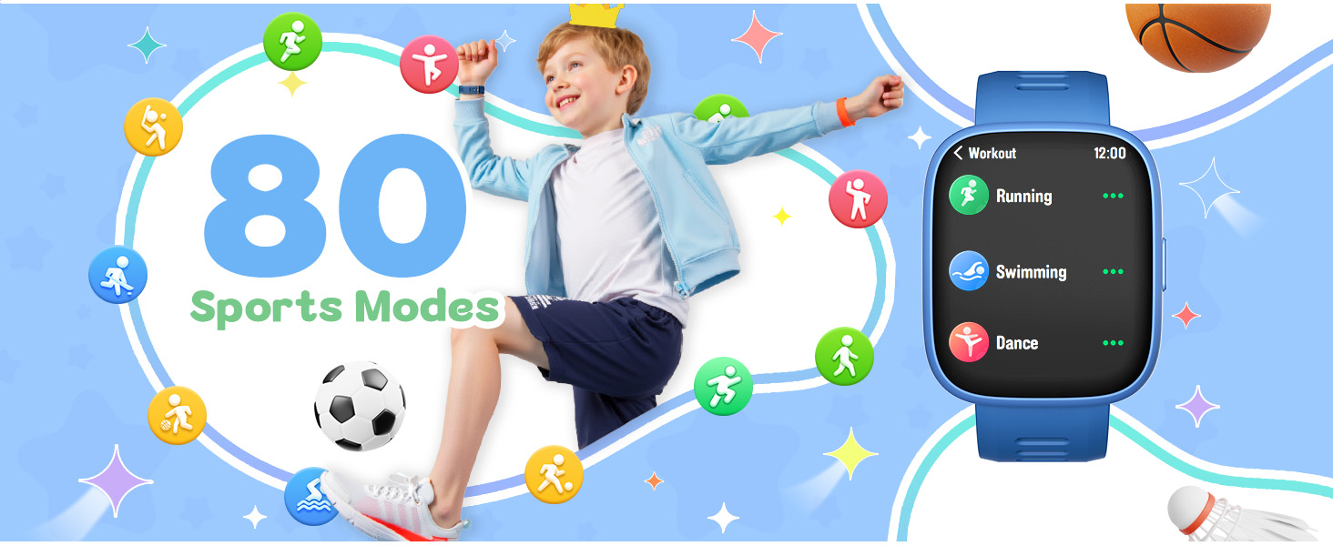 - All-Day Activity Tracking The Verfit Smart Watch for kids and teens automatically tracks steps, distance, calories burned, and active minutes. With support for 80+ sports modes—including walking, running, cycling, swimming (IP68 waterproof), and basketball—it’s the perfect companion for active kids.