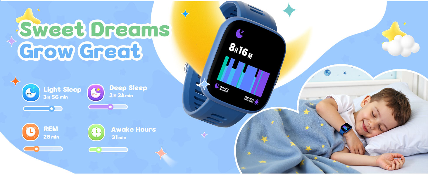 - Comprehensive Fitness & Health Tracking Promote your child’s well-being with real-time heart rate monitoring and advanced sleep tracking. The watch analyzes sleep stages (REM, light, deep) to provide insights into sleep quality. Note: Sleep tracking requires more than 3 hours of sleep and long-term wear for accurate results.
