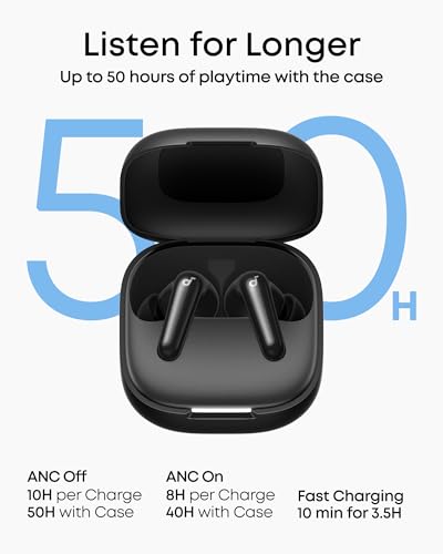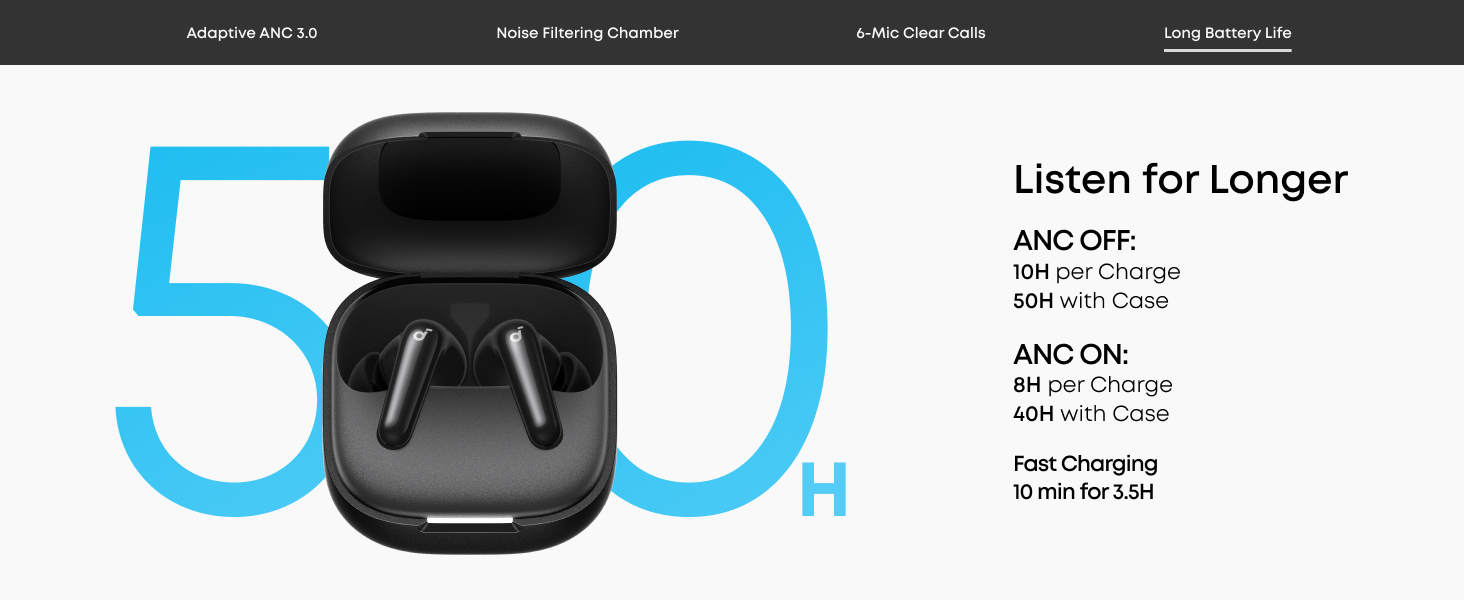 Listen for Longer: Get up to 10 hours of playtime on a single charge and a total of 50 with the case, with noise cancellation enabled, get up to 8 hours of playtime on a single charge and a total of 40 with the case. A 10-minute charge delivers up to 3 hours of playtime.