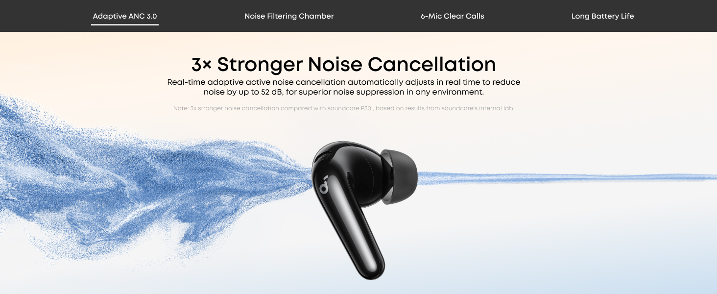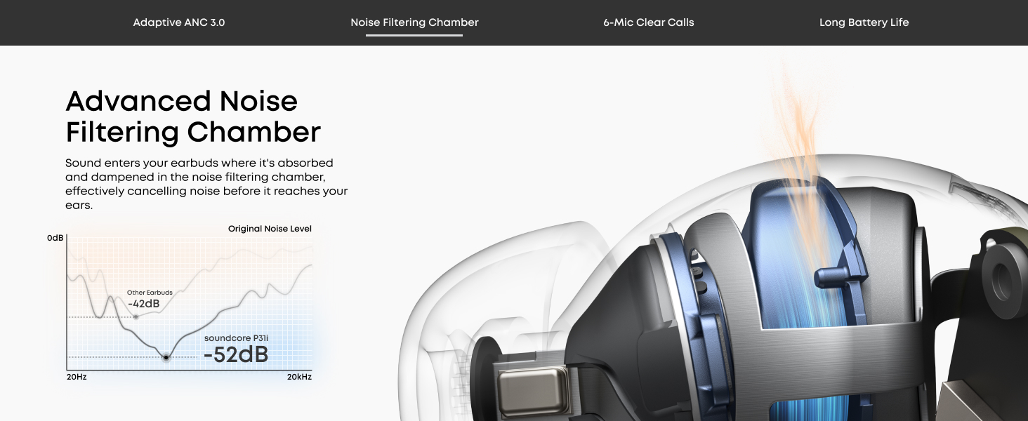 Real-Time Adaptive Noise Cancelling: Reduces noise by up to 52 dB with adaptive technology that detects your surroundings and automatically chooses the best noise-cancelling level for you.