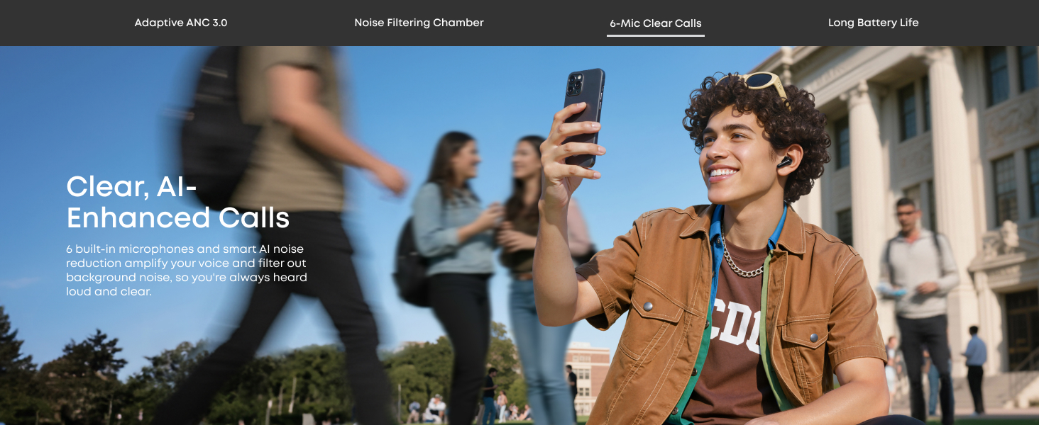 Crisp, Clear Calls: Six microphones and advanced AI work together to filter out external noise and wind for crystal-clear calls. Be heard loud and clear no matter where you are, for conversations that sound like they're face-to-face.