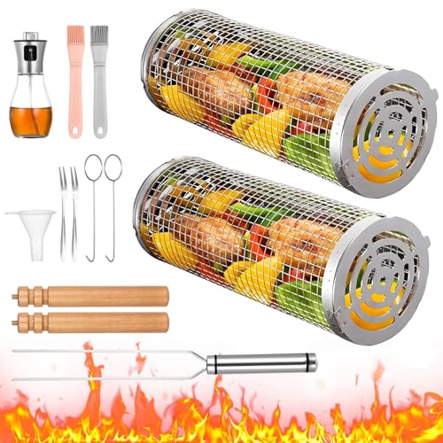 Stainless Steel BBQ Grilling Basket Set, 2 Rolling Mesh Baskets for Campfire and Outdoor BBQ, Accessories for Easy Cooking