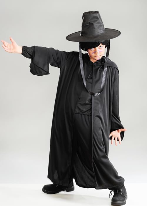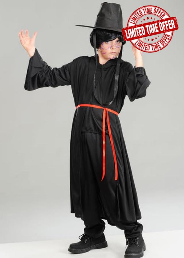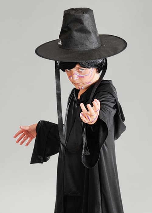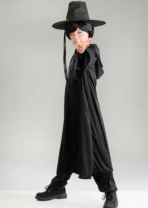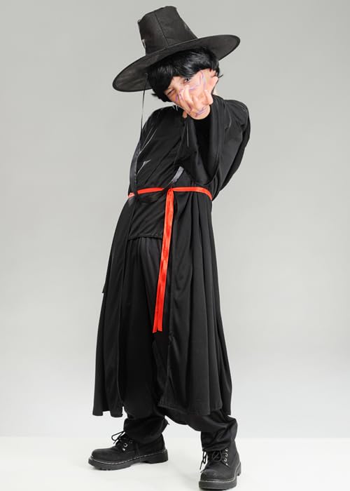 A fantastic boys Kpop Hunters inspired fancy dress costume, this childrens Saja Boy demon costume includes a long black hooded robe, a wide brim hat that features an attached black ribbon and a red belt. This costume comes in one standard size to fit approximately 6-10 years.