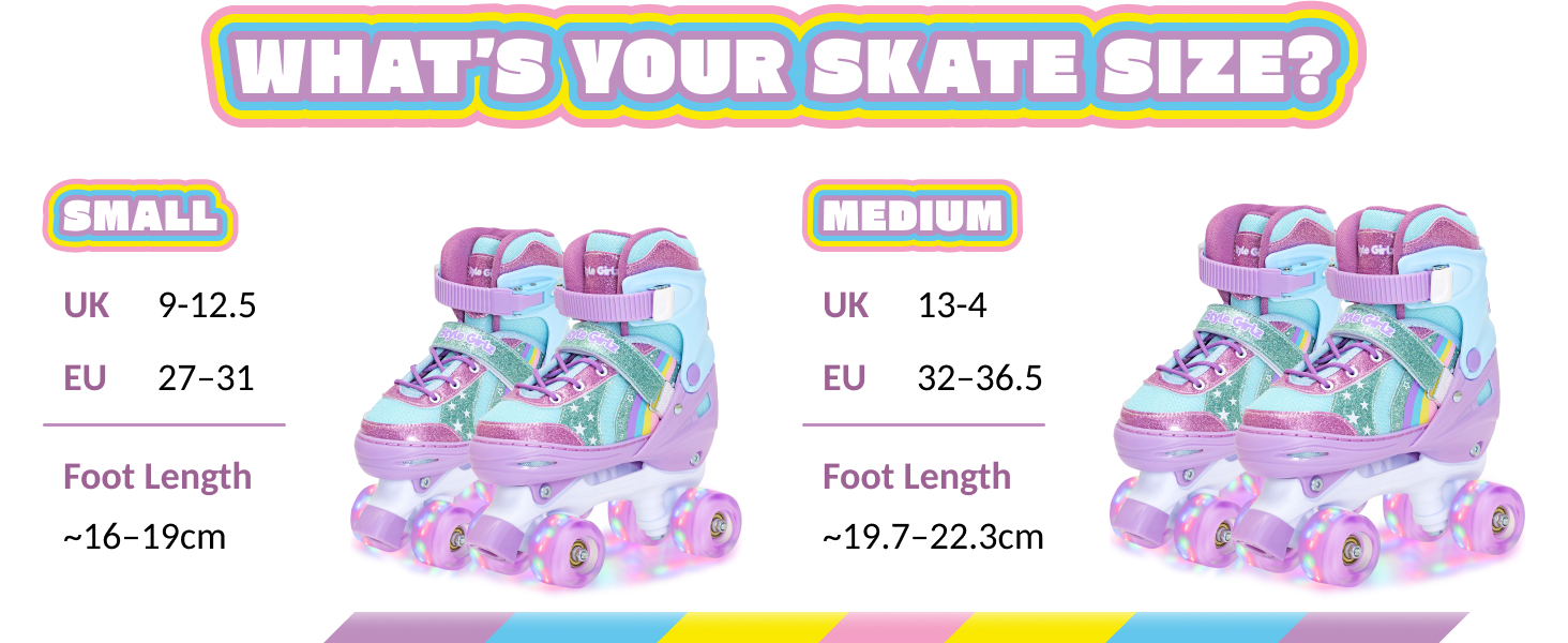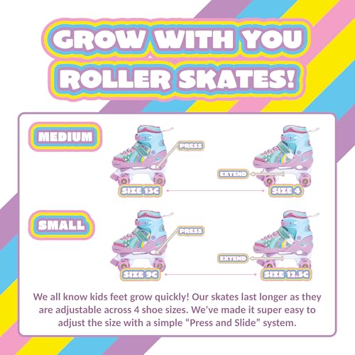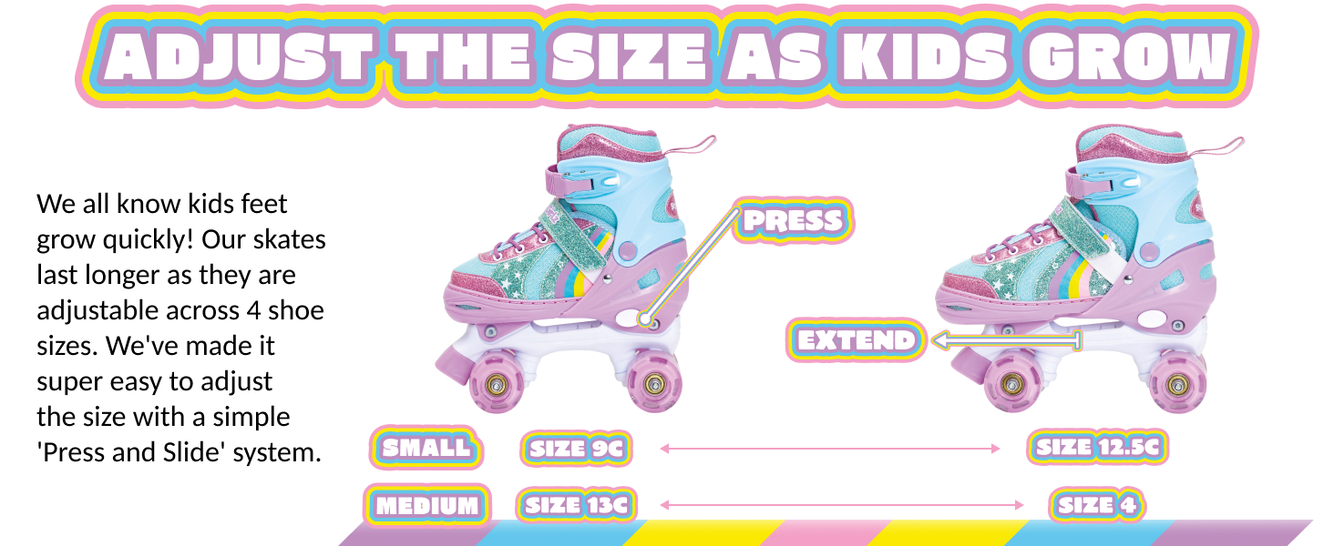 ADJUST THE SIZE AS KIDS GROW – We all know kids feet grow quickly! Our skates last longer as they are adjustable across 4 shoe sizes. We've made it super easy to adjust the size with a simple 'Press and Slide' system. Choose from 2 sizes; Small 9 – 12.5 or Medium 13 – 4