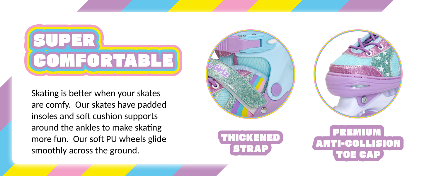 SUPER COMFORTABLE – Skating is better when your skates are comfy. Our skates have padded insoles and soft cushion supports around the ankles to make skating more fun. Our soft PU wheels glide smoothly across the ground.
