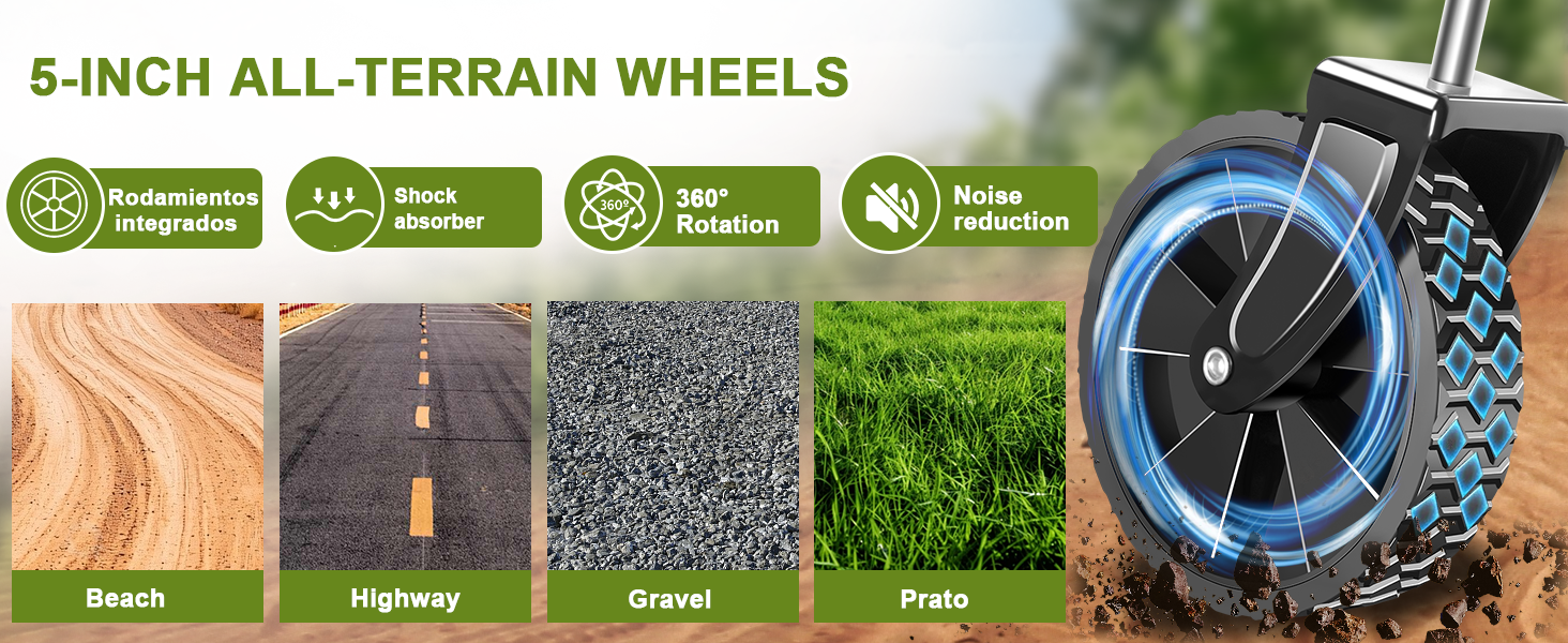 All-terrain wheels + adjustable extended grip: Equipped with 360° swivel front wheels, it can be easily steered and pushed on sandy beaches, meadows and uneven roads. The handle can be adjusted to three different heights, the longest extending to 105 cm, so it adapts to different body sizes, fits comfortably in the hand and is easier to push and pull.