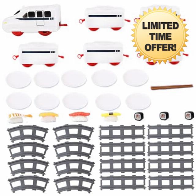 1 * Locomotive, 5 * Carriage, 10 * Plate, 8 * Curved Rail, 8 * Straight Rail, 7 * Sushi, 1 Pair * Chopsticks