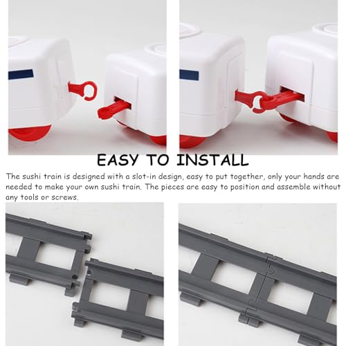 - Easy to install: The sushi train is designed with a slot-in design, easy to put together, only your hands are needed to make your own sushi train. The pieces are easy to position and assemble without any tools or screws.