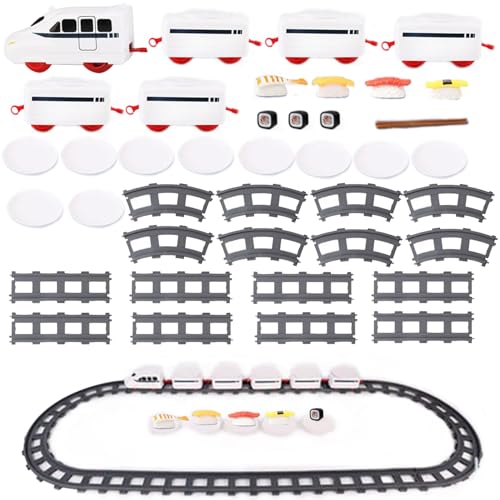 - Packing list: You will get a complete set of toys, including locomotive*1pc, carriages*5pcs, plates*10pcs, curved rails*8pcs, straight rails*8pcs, sushi*7pcs , chopsticks*1pair; the train's carriages include 5 sections, which are able to carry more food and make the train look more spectacular.