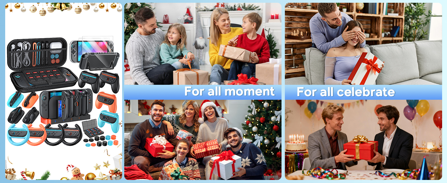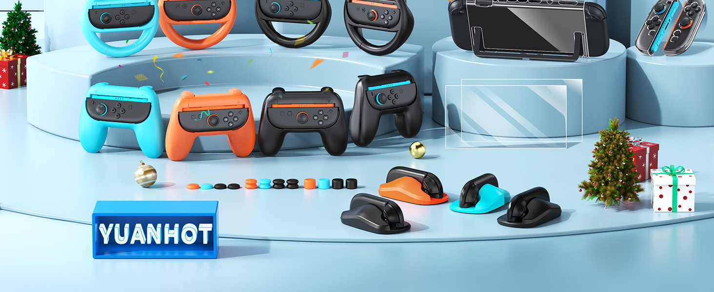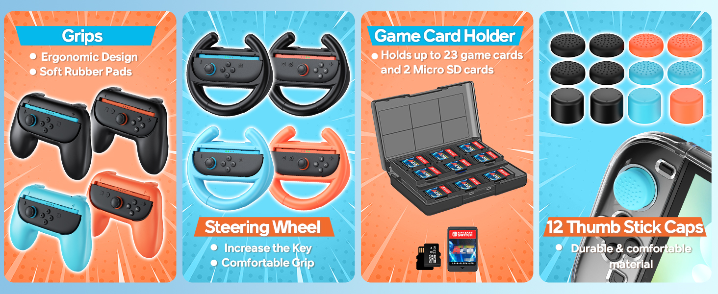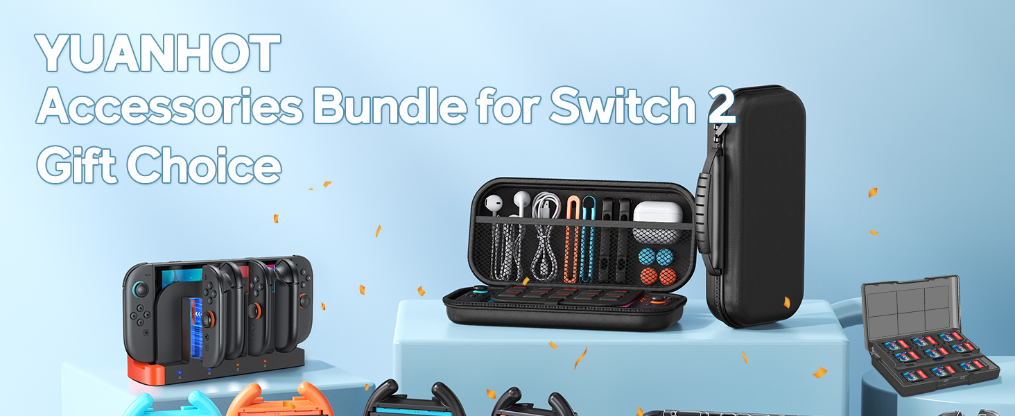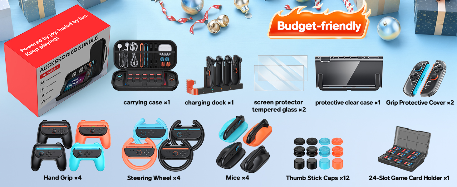- All-in-One Switch 2 Bundle Kit:The accessories bundle designed for Nintendo Switch 2 2025. Includes carrying case*1, charger dock*1, console protective shells*1,controller PC covers*2, screen protectors*2, steering wheel*4 for mario kart, hand grip*4, mouse grip*4, thump cap*12, game card case*1.This set covers all your needs, delivering a seamless gaming experience for you and your family, perfect for kicking off endless fun