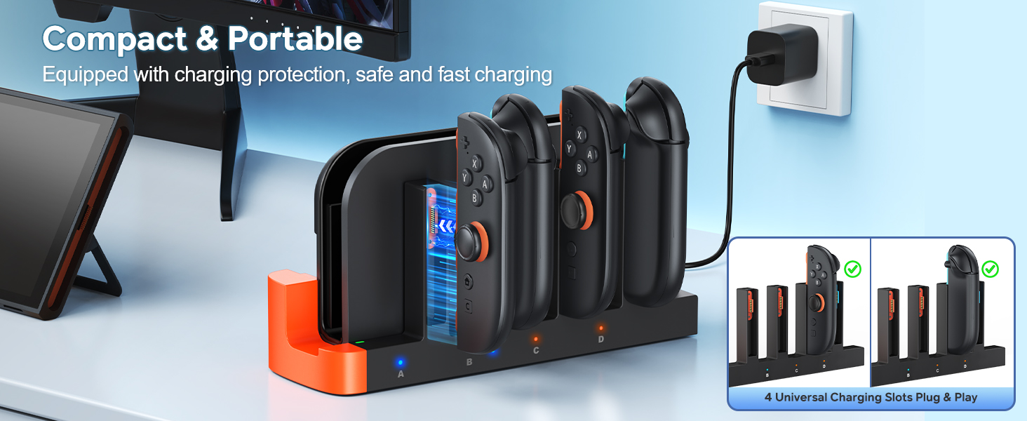 - Charge 4 Controllers Simultaneously:Designed for Joycon 2 controller, the fast charger dock powers up to 4 controllers at once. Its smart bidirectional charging ports eliminate worries about orientation. The dock-integrated design plugs directly into your original dock, reducing cable mess for a clean, organized setup