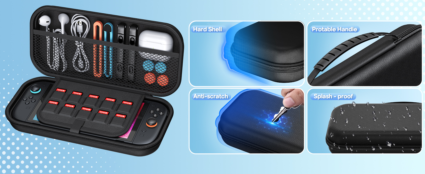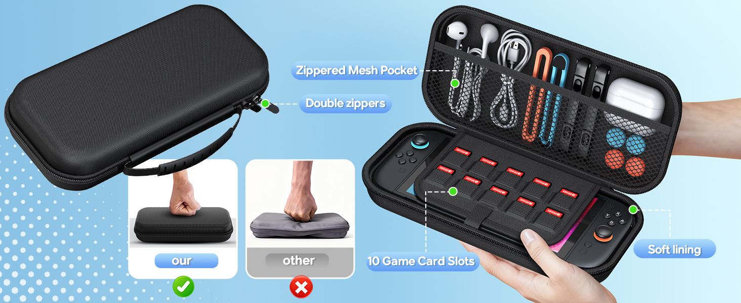- Switch 2 Travel Case: Organized Gaming On The Go:The portable carrying case is constructed with a durable EVA hard shell and soft interior lining for shock-absorption and scratch-proof protection. The mesh pocket securely stores cables and other gaming accessories. The case built in 10 cards slots and the kits come with game card box fits 23 game cards + 2 SD cards, making it your perfect mobile gaming station for commutes or parties