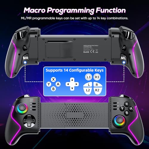 - 【MACRO Programming & Dual Vibration】 Switch 2 wireless retractable controller supports MACRO Programming Function. A single programmable rear key can be mapped to 14 different key combinations, and each action button (A/B/X/Y/L1/L2/R1/R2) can be individually set with three-mode vibration function (Off/Weak/Strong), delivering simplified gameplay and authentic, detailed feedback.
