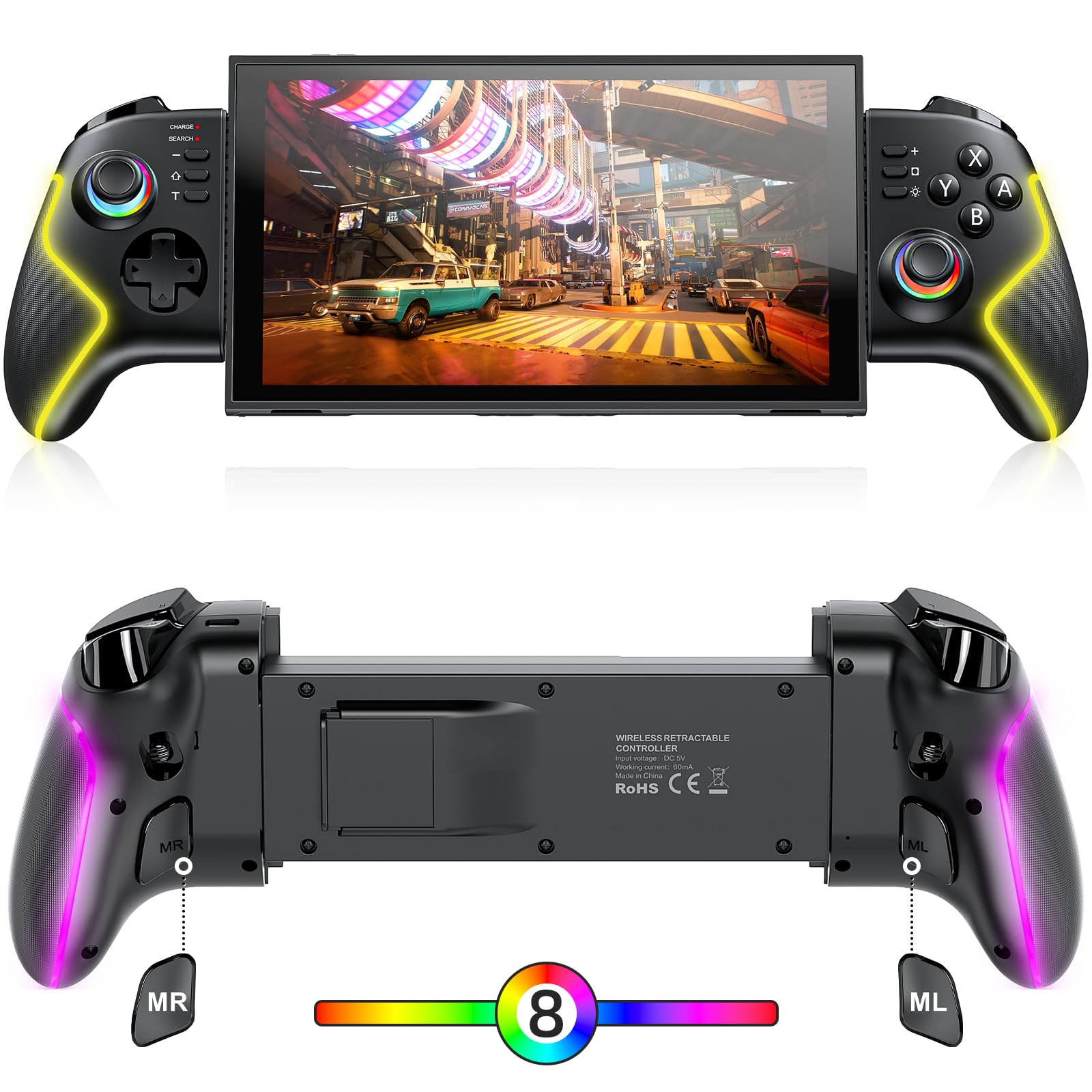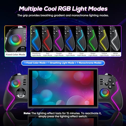 - 【Long Lasting Battery & Cool RGB Lighting】 This Switch 2 controller grip has auto-sleep and intelligent power management functions, which can dynamically optimize consumption according to usage status. It can be fully charged within 2.5 hours through the included Type-C cable and provides up to 10 hours of gaming time. With 8 RGB lights and 3 different light modes: breathing, fixed and monochrome, it allows Switch 2 player to change colors according to games and fully immerse in gaming experience. (NOTE: The controller automatically shuts down and enters sleep mode within 15 minutes without any button operation.)