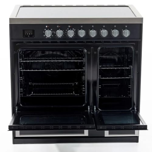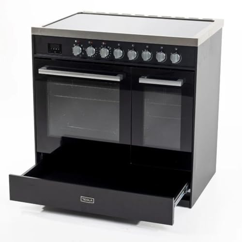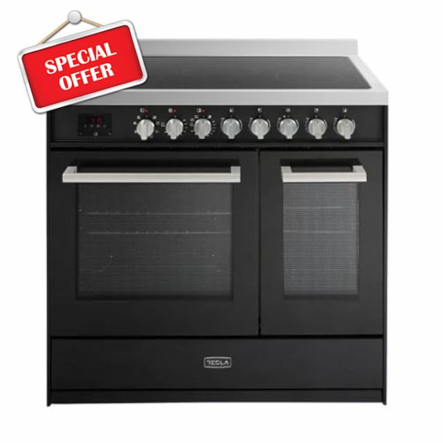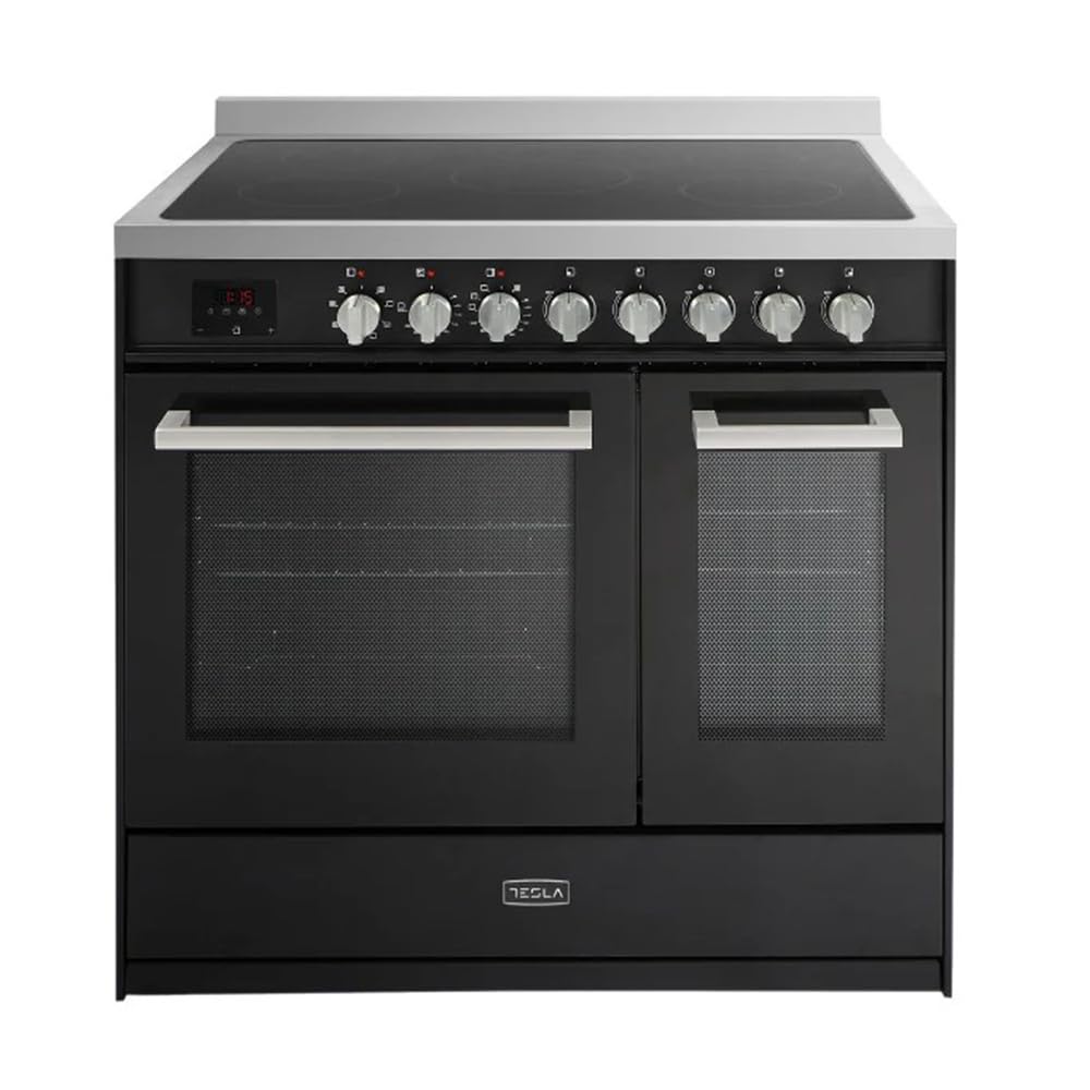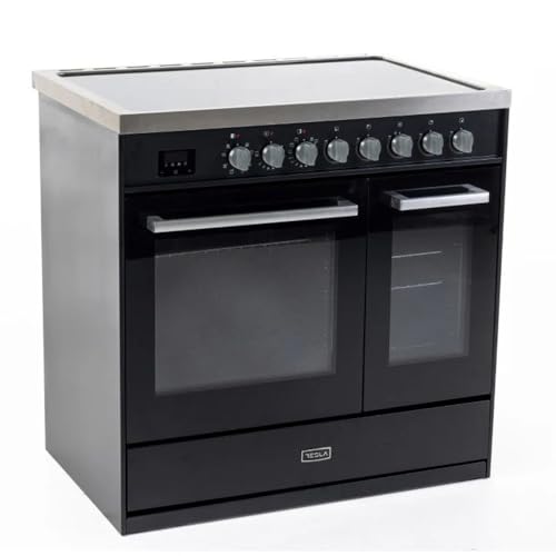Tesla Electric Cooker – Freestanding Black, A/A Energy, 5-Zone Ceramic Hob, 90cm Double Cavity, 63L & 36L Ovens, Easy Clean Enamel, LED Timer, (T90DCRCB) [Energy Class A]