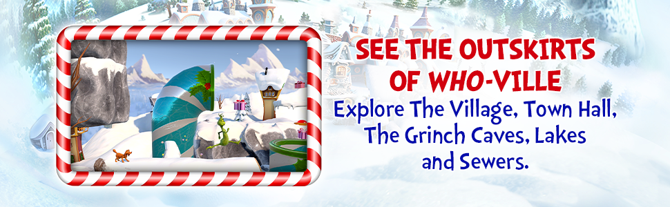 - SEE THE OUTSKIRTS OF WHO-VILLE – Explore The Village, Town Hall, The Grinch Caves, Lakes and Sewers.