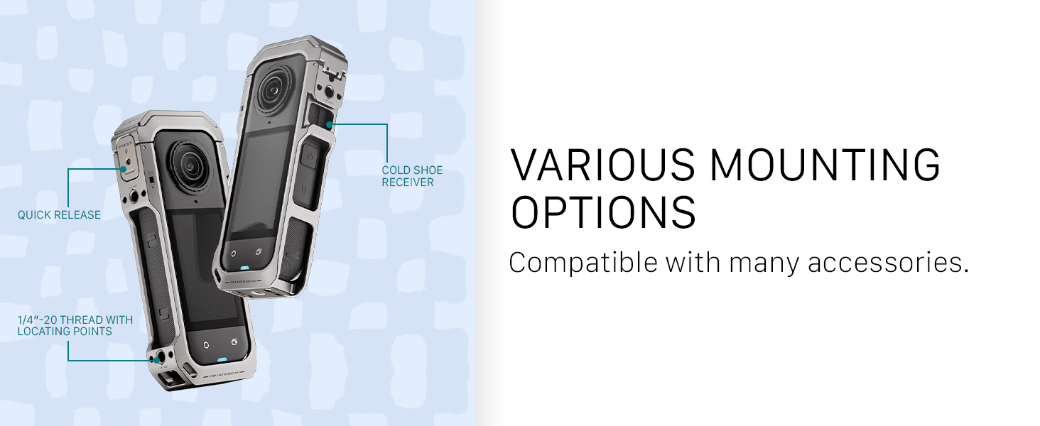 - The cage features several mounting options for a variety of accessories including a ¼”-20 thread with locating points and a Cold Shoe Receiver.