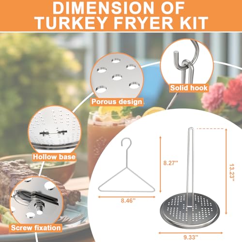 - Specifications: The Turkey Fryer Accessory Kit comprises a comprehensive set, including a Vertical turkey rack, a triangular lifter hook, a perforated base and mounting screws. Its equipped dimensions measure 9.33" in diameter for the base, a 12.85" rack length, and an 8.27" lift hook height. With assembly dimensions at 9.33" x 9.33" x 13.23", this kit is the perfect turkey frying accessories, ensuring everything you need to deep fry is neatly organized and ready for some delicious cooking.