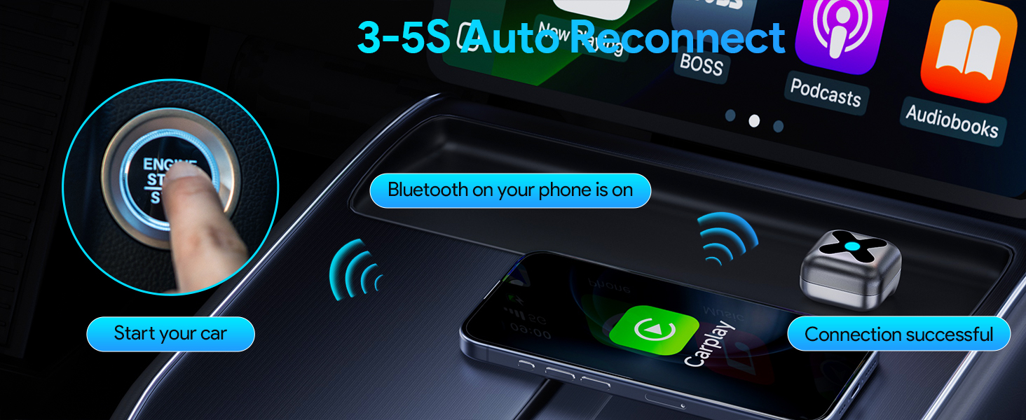 - 3-5s Fast & Auto-Connect – This wireless carplay adapter connects in 3-5 seconds, no delays or drops. It auto-links when you get in the car, keeping your drive smooth—no manual pairing every time. A reliable car play wireless adapter that saves your time and ensures consistent performance.