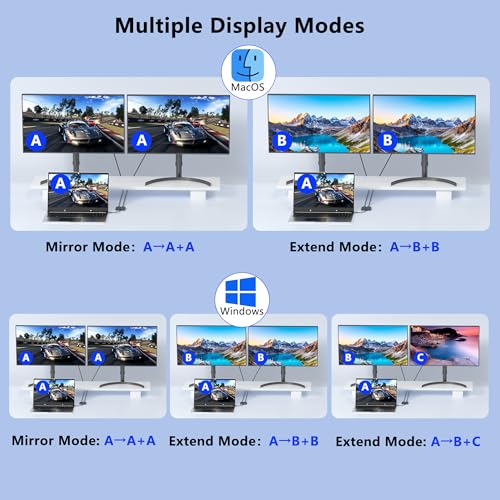 - 【USB C to Dual DisplayPort Adapter】You can connect device with USB Type C port to two external monitors with 4K DisplayPort output. For Mac OS, it ONLY Mirror Mode, Can't extend two different Screen due to Mac OS limitation. For Windows OS,it supports both SST and MST mode. (Important: NOT for all USB-C port laptop, you need to confirm that your host device's C port supports video output or DP Alt Mode)