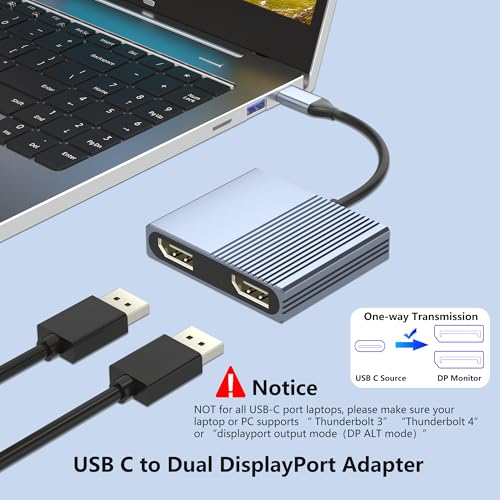 USB C to Dual Displayport Adapter for Mac/Dell/HP Laptop, 4K@60Hz Displayport Splitter 1 in 2 Out for Dual Monitors Extended Display, USB C to Display Port Cable, Dual Monitor Adapter, MST Hub