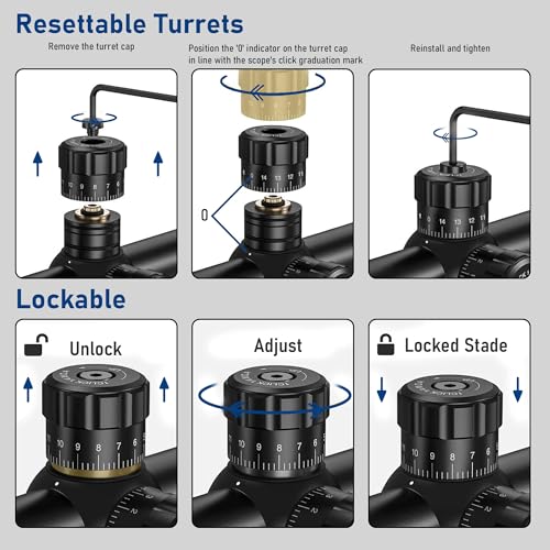 Resettable Zero:Use the included Allen key to loosen the hex screw for resetting your scope. Align the "0" with the baseline and tighten the screw to easily return to your preferred aim point.