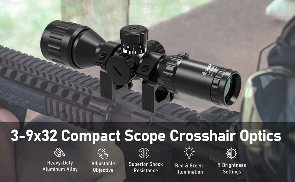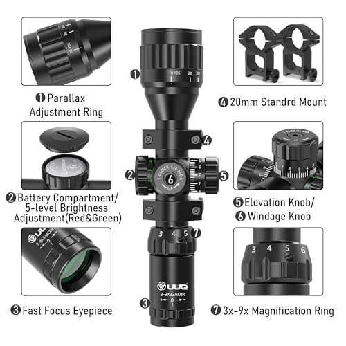 UUQ 3-9×32 Tactical Rifle Scopes,Front AO (Parallax Adjustment) Red Green Illuminated, Mil-dot Reticle,Locking/Hold Zero Turrets, High Profile Mount Rings