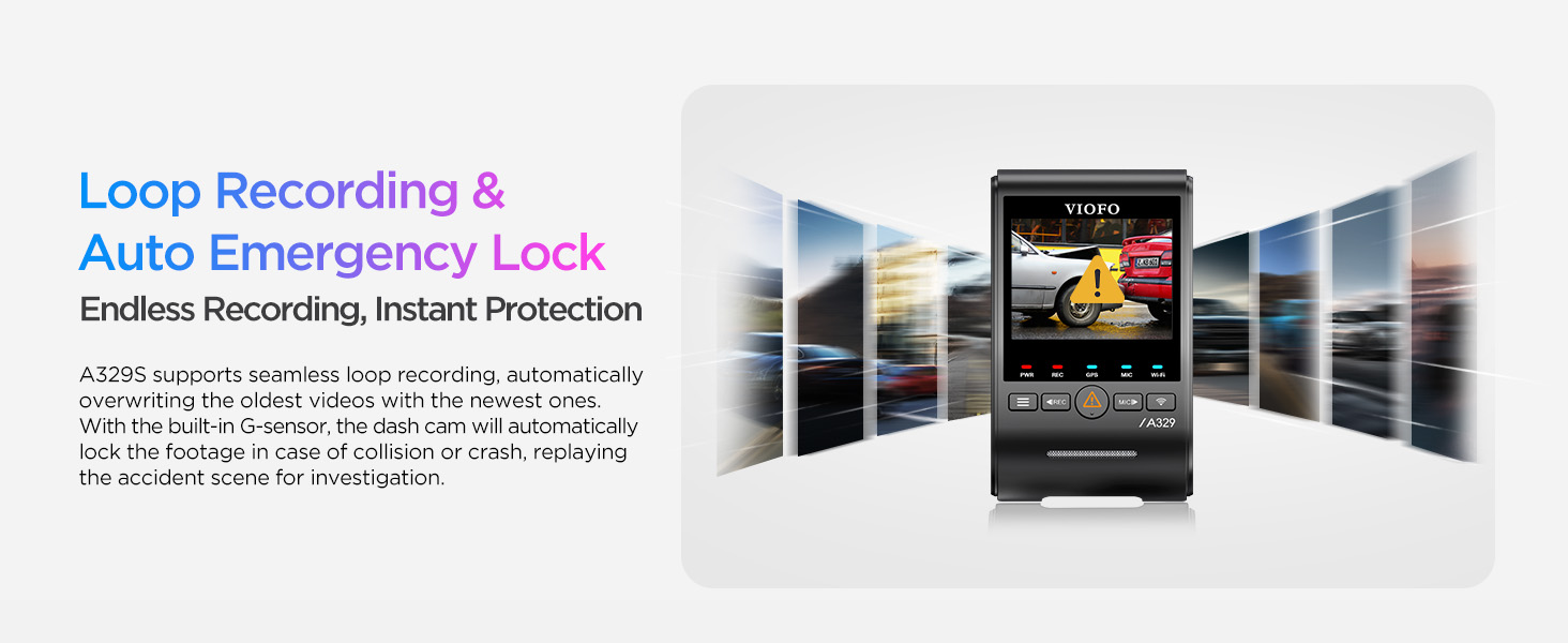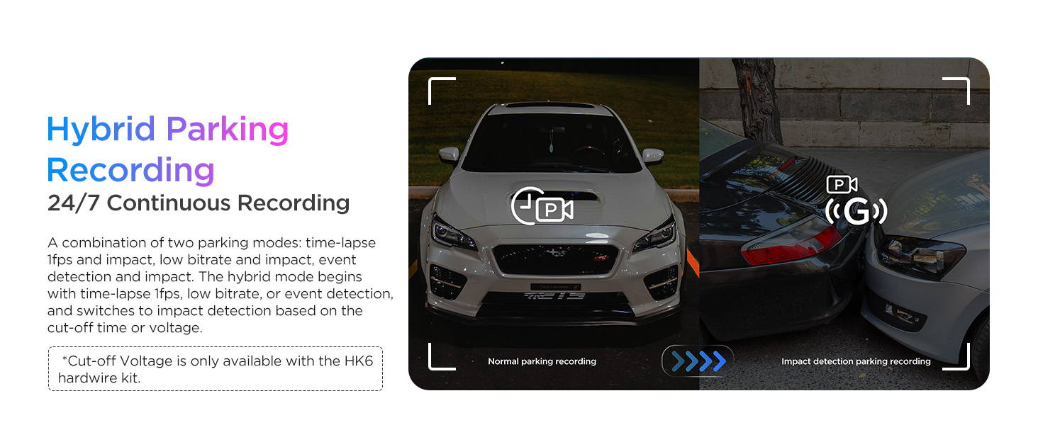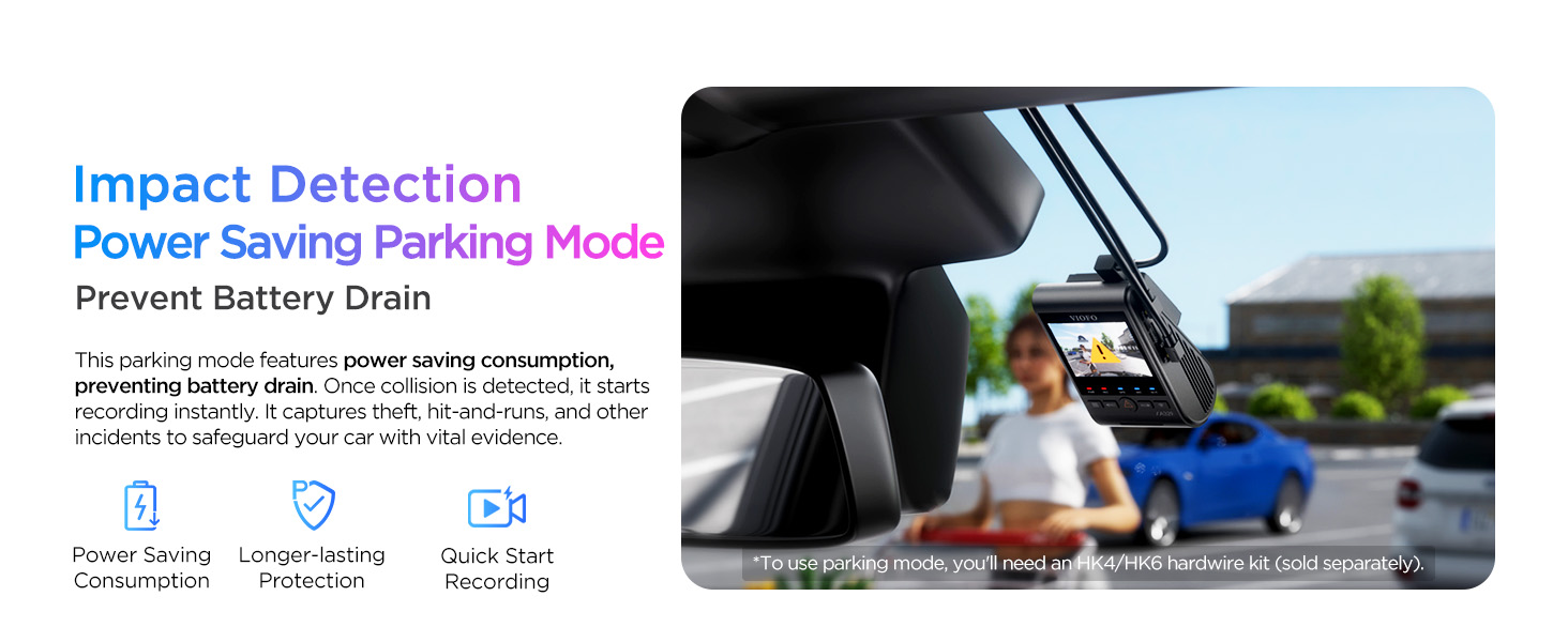 - [Impact Detection Power Saving Parking Mode] The A329S dashcam supports an ultra-low-power parking mode to prevent battery drain. Once collision is detected, it starts recording instantly. These features minimize battery drain while ensuring continuous monitoring when your car is parked. These modes can be easily activated using the HK4/HK6 Hardwire Kit(*Note: The hardwire kit is not included.).