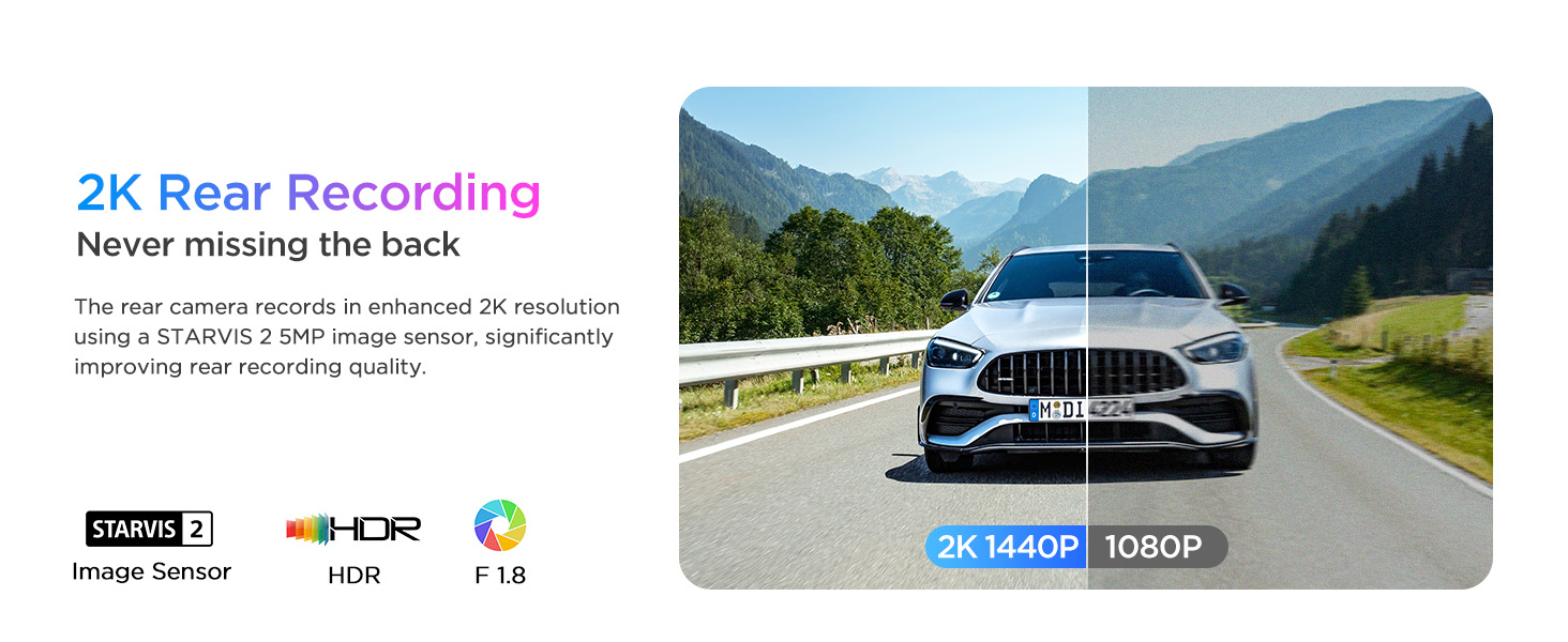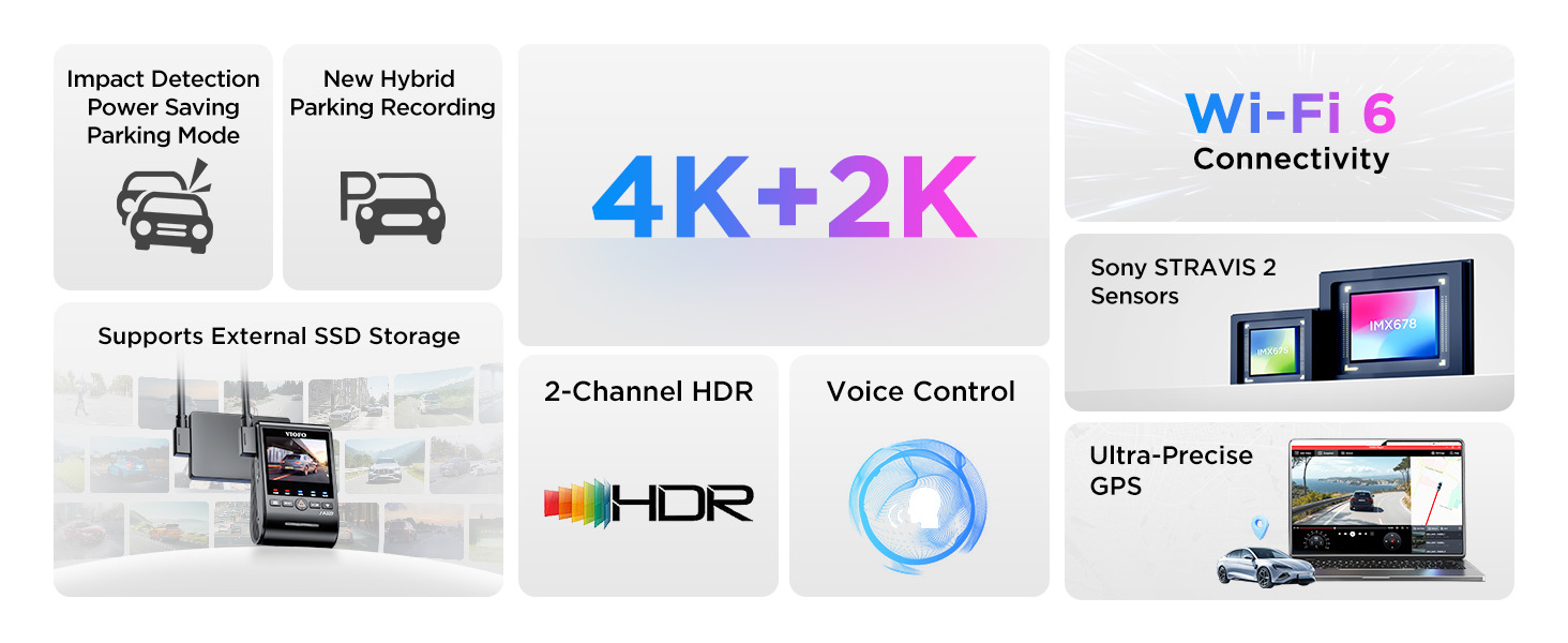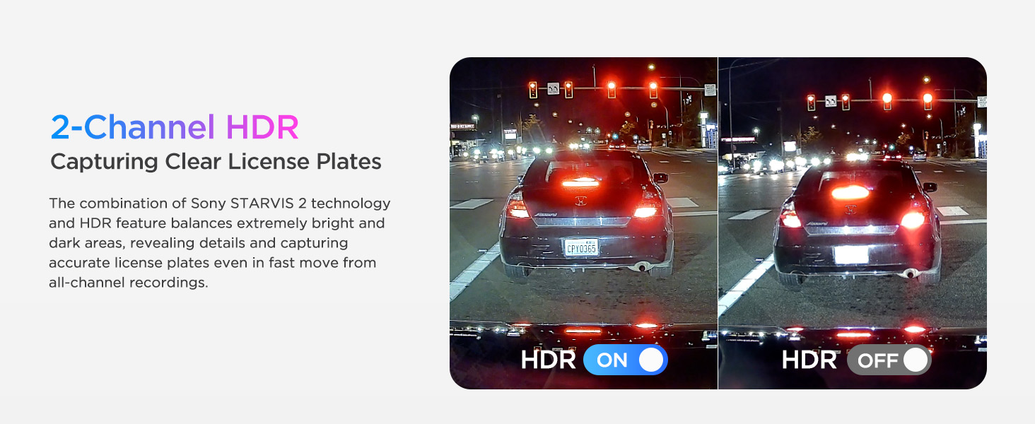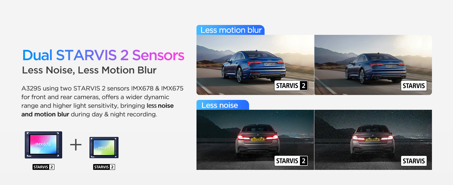 - [Advanced Dual STARVIS 2 Sensors] The A329 4K dash cam features dual STARVIS 2 sensors. The front camera deploys STARVIS 2 IMX678 image sensor that packs in more pixels for greater clarity and detail, achieving less noise in low light and less motion blur in fast motion. The rear camera deploys STARVIS 2 IMX675 image sensor, featuring an impressive 2.5 times wider dynamic range than the STARVIS pixel of the same size, capturing exceptionally clear and sharp videos.