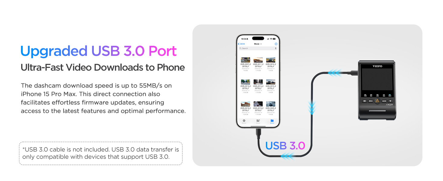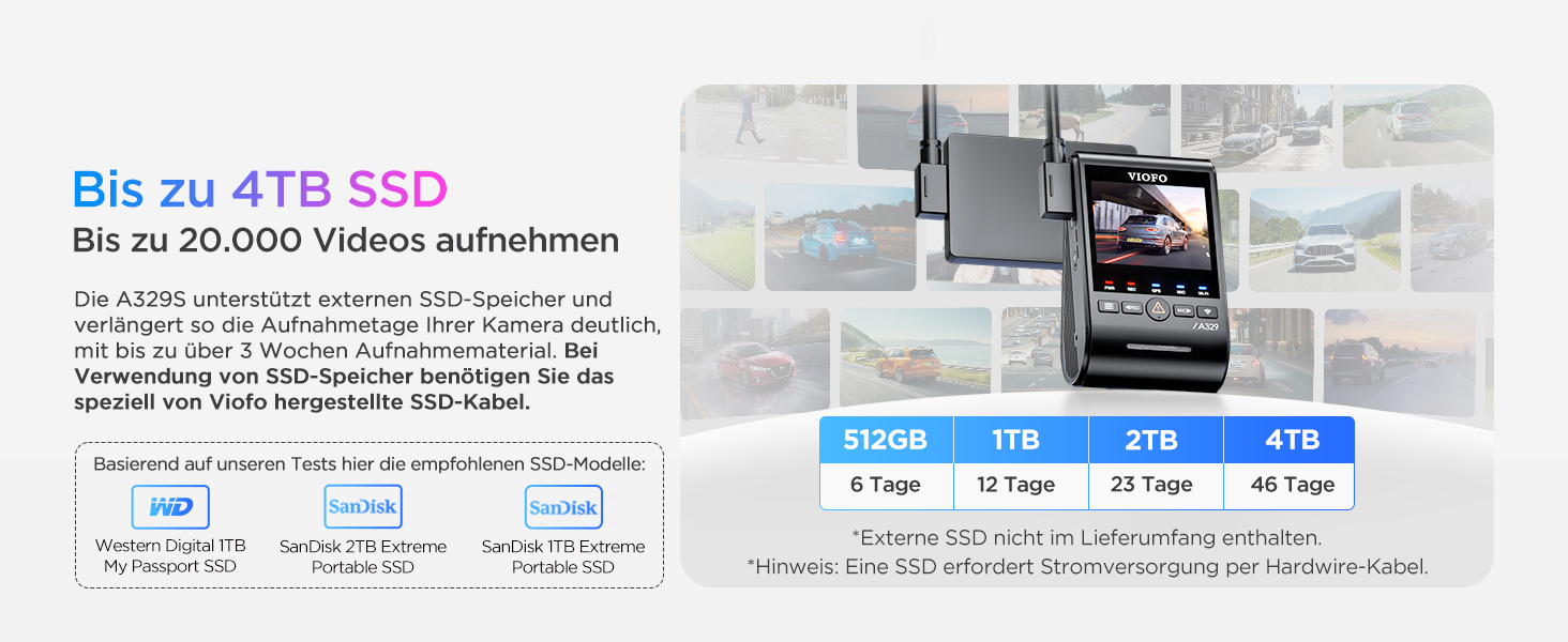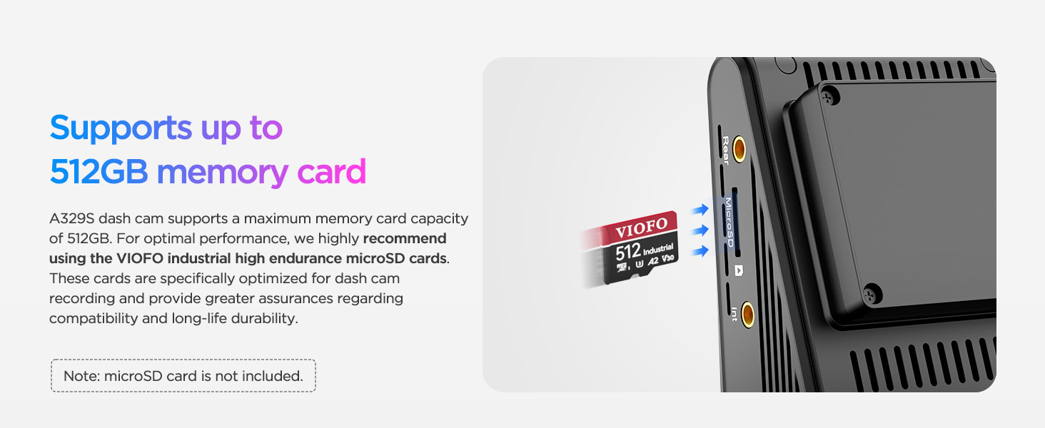 - [Support Up to 4TB SSD or 512GB microSD] Say goodbye to storage limitations! The A329S supports external SSDs up to 4TB or microSD cards up to 512GB, allowing for uninterrupted recording for over 3 weeks. Perfect for long road trips without constant overwriting worries. We recommend using the optional VIOFO Type-C SSD cable. (*Note: microSD card and SSD storage are not included. )