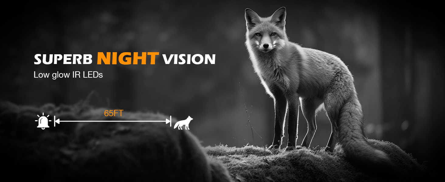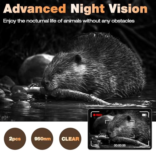 【Low Power Consumption & Clear Night Vision】 TC33 mini wildlife camera operates with just 4 AA alkaline batteries, reducing weight and extending standby time. The trail camera features 2pcs 950nm night vision lights, enabling the garden camera to work effectively in low-light conditions and capture clear images. (black and white at night)