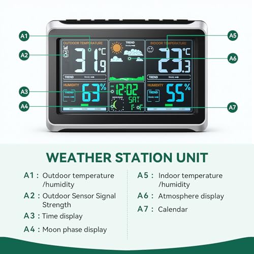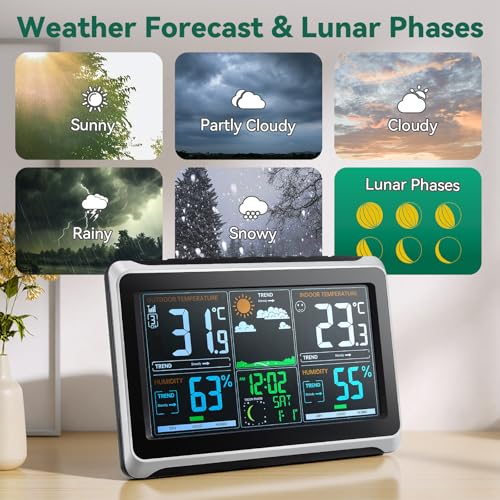 - [Multiple Weather Information] The home weather station comes with a display console that provides a wealth of information, including time, calendar, weather forecast, lunar phase, indoor/outdoor temperature/humidity, low battery alerts, alarm clock, sleep timer, and comfort display. It also supports 7 languages, making it a versatile tool for both your home and office.
