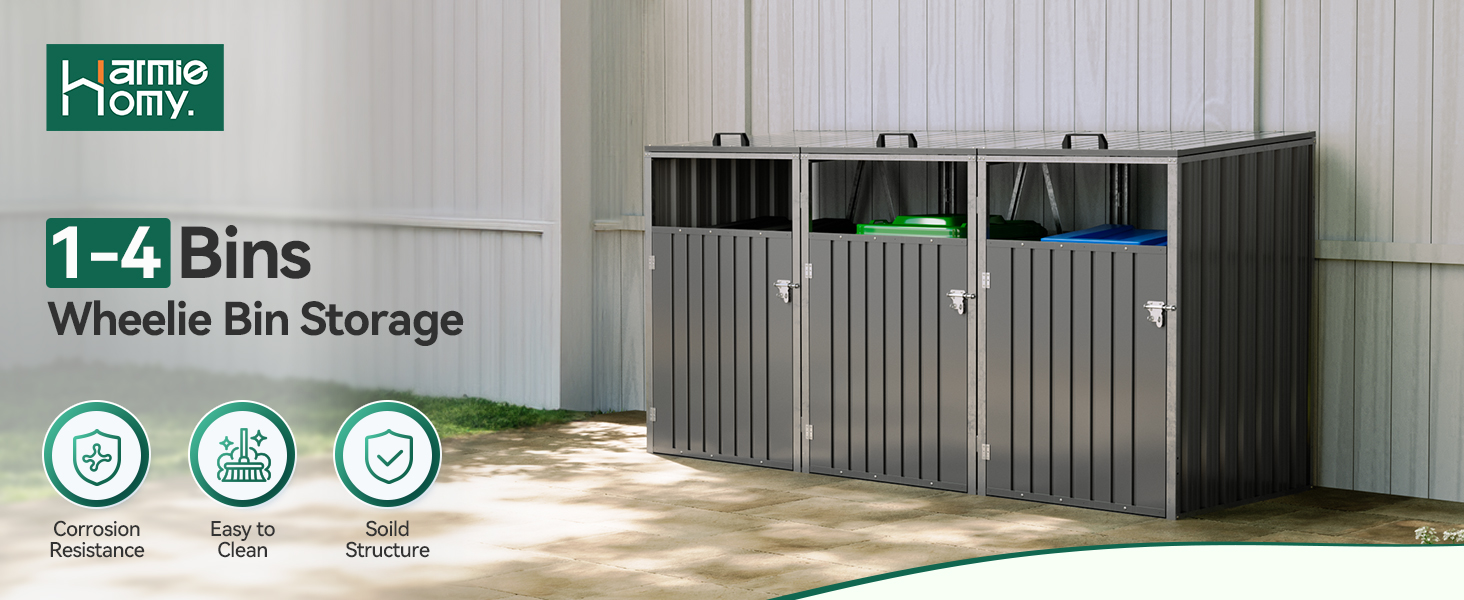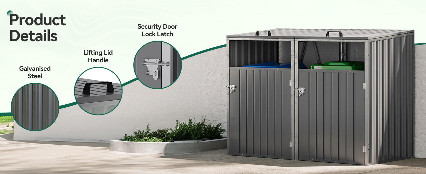 【Sturdy Galvanized Steel Construction】Crafted from powder-coated galvanized steel, this wheelie bin storage boasts exceptional strength, superior corrosion resistance, and excellent heat resistance. It’s built to withstand harsh outdoor conditions, ensuring long-lasting durability of reliable use.
