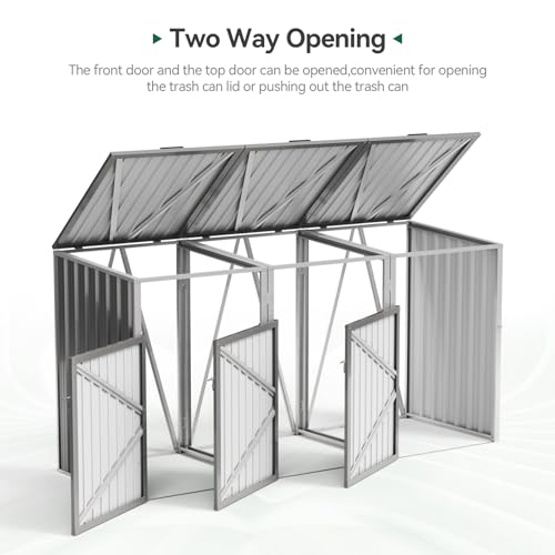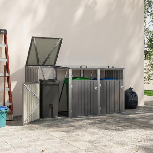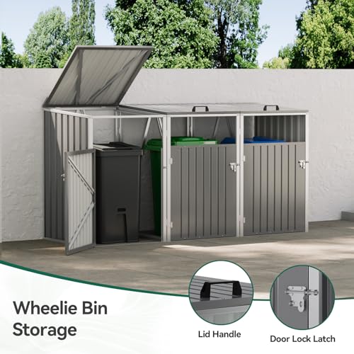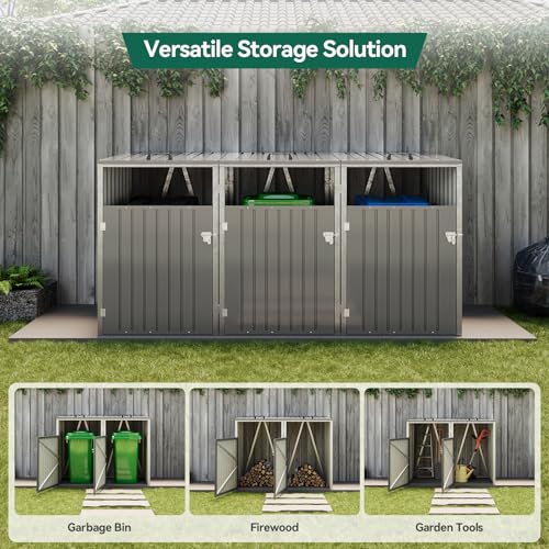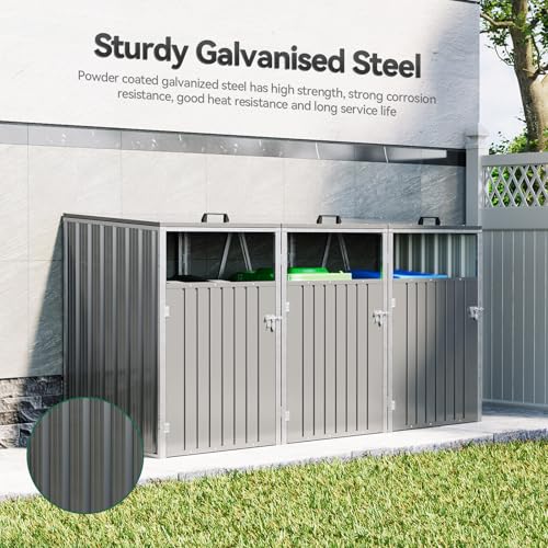 Warmiehomy Wheelie Bin Storage 3 Bin Storage for Wheelie Bins Galvanized Steel Outdoor Garbage Can Store with Locking Door Triple Wheeled Bins Hideaways with Lifting Lids,Grey