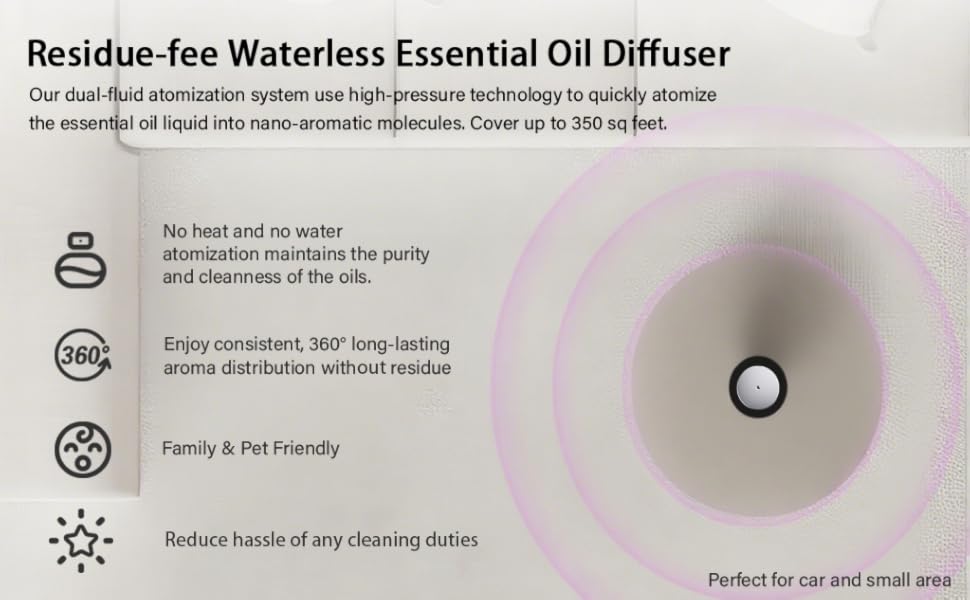 - 【WATERLESS TECHNOLOGY】 – Using advanced two-fluid cold atomization technology, this waterless diffuser transforms each drop of essential oil into a fine 'nano mist.' The result is a more delicate, even, and powerful aroma distribution. Unlike traditional ultrasonic diffusers, it offers a natural, more convenient, and safer alternative, with no harmful substances released.