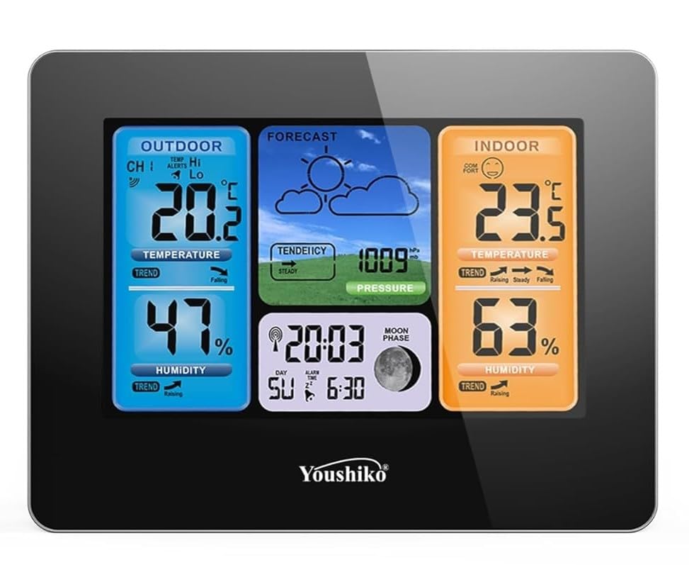 - Offered by UK Based Company with UK Warranty & after sales support, Weather forecast with display of weather trend (with animation) , Multi-colour section display for time & weather information , Big digit in & outdoor / Indoor temperature (°C/°F) & humidity readings , Indoor comfort level , outdoor temperature / Humidity alert.