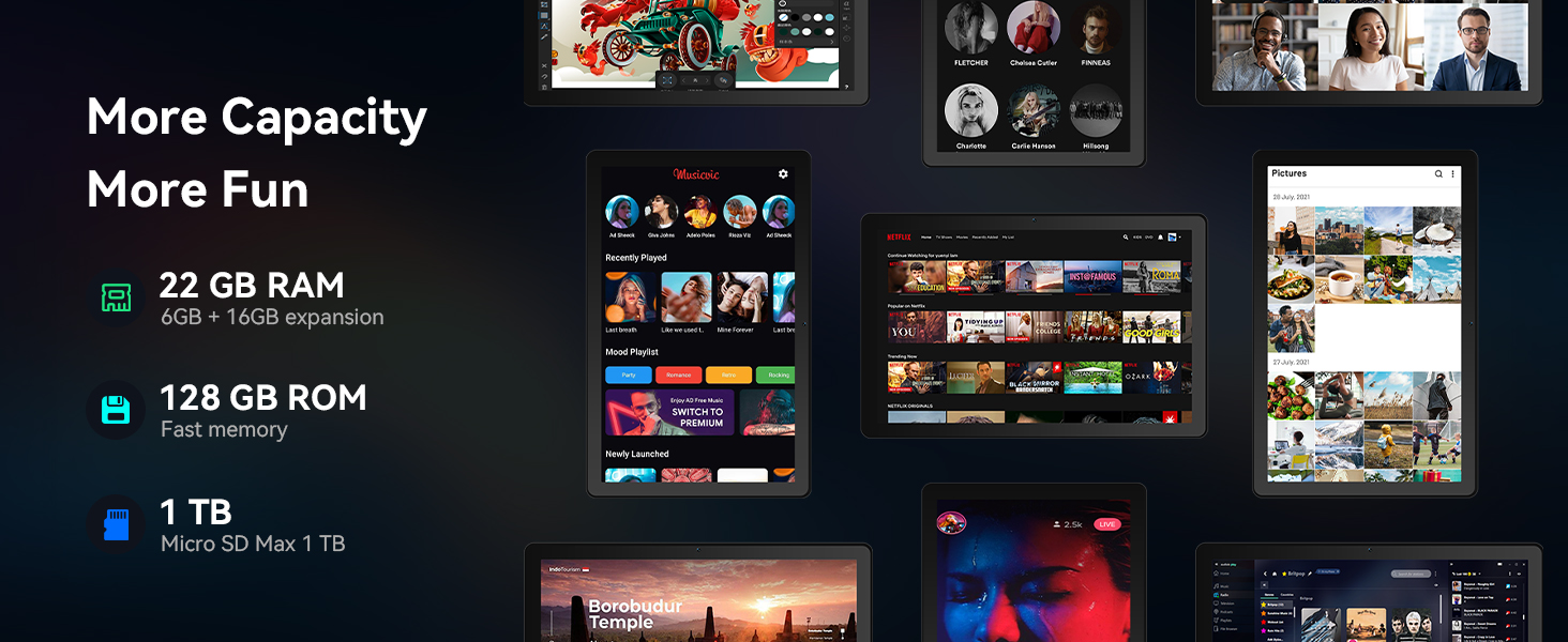 【22GB RAM & 128GB ROM & 1TB TF】The Android 15 tablets Equipped with 6GB of physical RAM and expandable up to 22GB total memory via intelligent RAM expansion technology, the G13 ensures lag-free performance even with multiple apps running. It offers 128GB of fast internal storage, expandable up to 1TB via TF card, providing ample space for apps, 4K videos, photos, and documents.